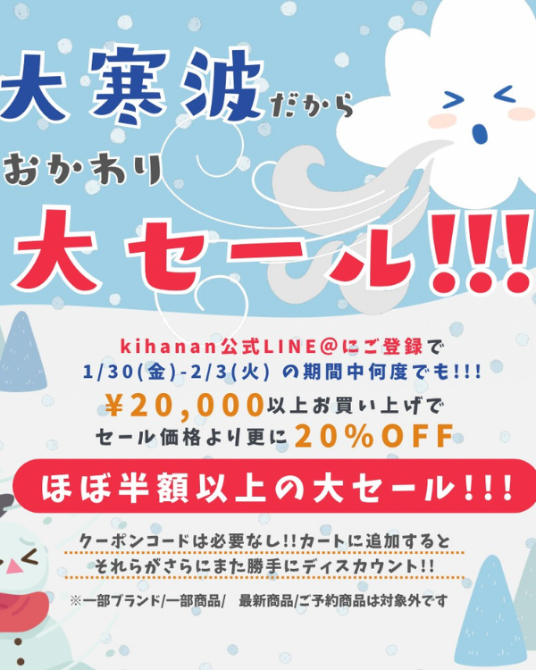 1/30(金)-2/3(火) 大寒波だから!おかわり大SALE スタート!!!!!