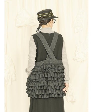 大きめのポケットがフリルの間に付いていて、ポケットのないお洋服の時にも大変便利で、春夏、秋冬もコートやジャケットの上にも重ねられるオーバーサイズにしています。
