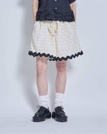今回は丈長めの膝上、広がりを沢山つけて、足がほっそりと見えるようにデザインしています。ここまで裾の広がりがあるショートパンツはなかなかないと思います。
