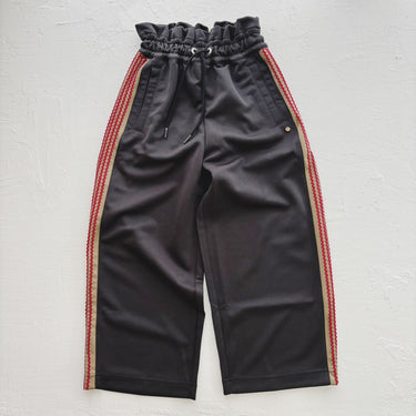 トップスをインして、ハイウエストで履いてスタイルアップ 腰で履いていただくとまるっこいシルエットになる 形がとてもかわいい変形のトラックパンツ。