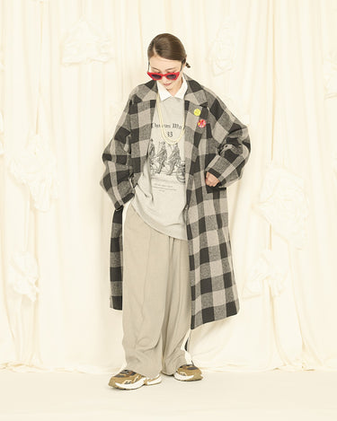 膝下くらいになる長めの着丈にしています。ややオーバーサイズで、スタッフに大変人気の高いコートです。体型は選びません。アーム、身頃はかなりゆったりしています。袖が曲げられるので身長が低めの方にも良いと思います。