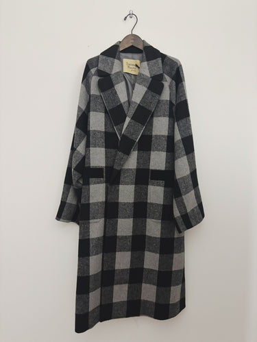 やわらかな肌触りのウールとポリが入っているバッファローチェックのコートを作りました。ウールの比率が高いのでとても暖かく、ポリエステル混で軽いコートです。