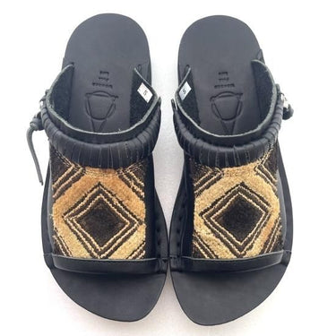 コンゴ中央部のクバ王国で織られた自由で独創的な文様の草ビロードを使い日本の熟練の靴職人が手仕事で仕上げているサンダル。