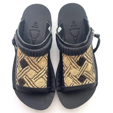 コンゴ中央部のクバ王国で織られた自由で独創的な文様の草ビロードを使い日本の熟練の靴職人が手仕事で仕上げているサンダル。