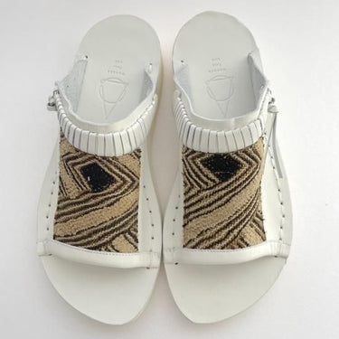 コンゴ中央部のクバ王国で織られた自由で独創的な文様の草ビロードを使い日本の熟練の靴職人が手仕事で仕上げているサンダル。