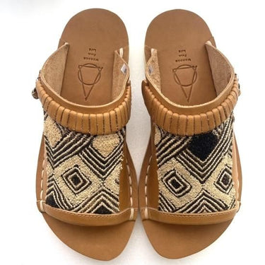 コンゴ中央部のクバ王国で織られた自由で独創的な文様の草ビロードを使い日本の熟練の靴職人が手仕事で仕上げているサンダル。