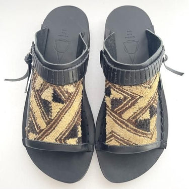 コンゴ中央部のクバ王国で織られた自由で独創的な文様の草ビロードを使い日本の熟練の靴職人が手仕事で仕上げているサンダル。