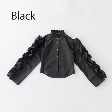 襟とスリーブにボリュームたっぷりのフリルをあしらったブラウスです。