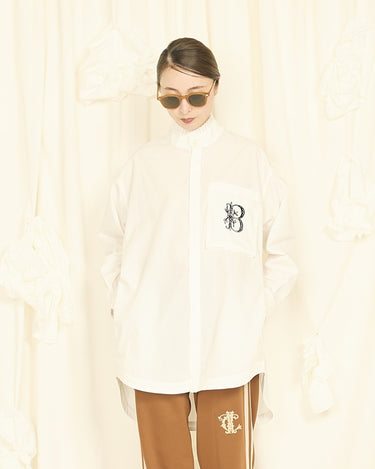 初めてのデザイン。フリル付きのハイネックオーバーサイズシャツをデザインしました。