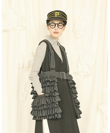 大きめのポケットがフリルの間に付いていて、ポケットのないお洋服の時にも大変便利で、春夏、秋冬もコートやジャケットの上にも重ねられるオーバーサイズにしています。